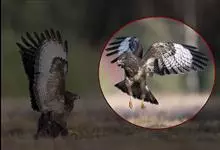 普通鵟:是鹰科、鵟属鸟类,属中型猛禽。体长54厘米,翼展122-137厘米,体重515-810克。体色变化较大,上体主要为暗褐色,下体主要为暗褐色或淡褐色,具深棕色横斑或纵纹,尾淡灰褐色,…全部>>