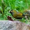 黄喉噪鹛体型略小,顶冠蓝灰色,特征为具黑色的眼罩和鲜黄色的喉。上体褐色,尾端黑色而具白色边缘,腹部及尾下覆羽皮黄色而渐变成白色。黄喉噪鹛隐匿于亚热带常绿林和浓密灌丛,于地面杂物中取食,喜食昆虫,…全部>>