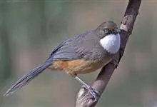 白喉噪鹛中型鸟类,体长26~30厘米。前额或整个头顶棕栗色,其余上体橄榄褐色。颏、喉白色,胸具橄榄褐色横带,腹辉棕色或棕白色。外侧四对尾羽具宽阔的白色端斑。指名亚种的额呈棕色,…全部>>