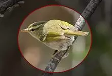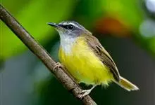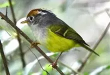 黑脸鹟莺:体长10厘米,是有特色的体小而多彩的莺鸟。粗眉纹,颏、喉及尾下覆羽黄色,脸罩黑,头顶及颈背灰色,上体绿,无翼纹,腹白。虹膜褐色;上嘴色深,下嘴肉色;脚偏绿色。…全部>>