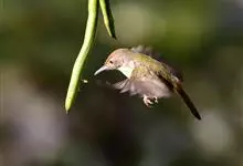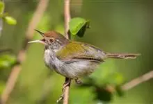 普通缝叶莺,是雀形目鹅科莺亚科缝叶莺属一种。体长10-14厘米,体重7-10克,雄鸟前额棕红,头顶至枕棕橄榄褐,上体橄榄绿染黄,飞羽及尾羽暗褐;繁殖期雄鸟的中央尾羽特形延长,下体淡皮黄白色。…全部>>