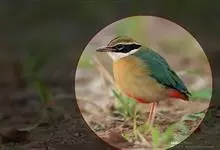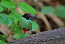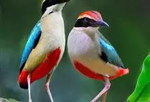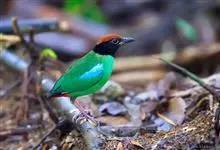 绿胸八色鸫:是雀形目八色鸫科的鸟类,共有12个亚种。体长为16-18厘米,体重65-69克。体型圆胖,尾短,腿长。头黑,上体绿色,两翼深色而具白色斑纹,头顶至后枕深褐,胸及腹部苹果绿,臀亮红。…全部>>