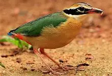 栗头八色鸫又叫锅巴雀,体长为24-26厘米,体重100-135克,是雀形目八色鸫科的鸟类。体型圆胖,尾短,腿长,常在森林底层或低植被中找食无脊椎动物。叫声简单哀婉。…全部>>