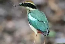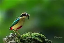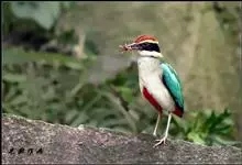 绿胸八色鸫:是雀形目八色鸫科的鸟类,共有12个亚种。体长为16-18厘米,体重65-69克。体型圆胖,尾短,腿长。头黑,上体绿色,两翼深色而具白色斑纹,头顶至后枕深褐,胸及腹部苹果绿,臀亮红。…全部>>