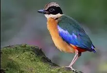 绿胸八色鸫:是雀形目八色鸫科的鸟类,共有12个亚种。体长为16-18厘米,体重65-69克。体型圆胖,尾短,腿长。头黑,上体绿色,两翼深色而具白色斑纹,头顶至后枕深褐,胸及腹部苹果绿,臀亮红。…全部>>