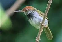 黑喉缝叶莺:体长11.5厘米,是一种小型的顶冠棕色、腹部白色的莺。尾甚长而常上翘,臀黄色,具特征性的偏黑色喉,上体橄榄绿色,头侧灰色。雌鸟色暗,头少红色且喉少黑色。与长尾缝叶莺的区别在后顶冠亦为棕色,…全部>>