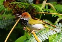 普通缝叶莺,是雀形目鹅科莺亚科缝叶莺属一种。体长10-14厘米,体重7-10克,雄鸟前额棕红,头顶至枕棕橄榄褐,上体橄榄绿染黄,飞羽及尾羽暗褐;繁殖期雄鸟的中央尾羽特形延长,下体淡皮黄白色。…全部>>