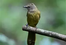 黄绿鹎,小型鸟类,体长19-22厘米。额至头顶暗褐具灰色羽缘,眼先黑色,其上面有一粗著的白纹从鼻后至眼,在黑色的头部极为醒目。上体橄榄绿褐色。颏、喉淡灰色或灰白色,胸灰褐色具橄榄黄色羽缘,…全部>>