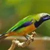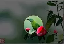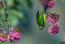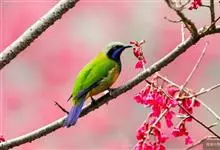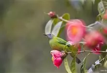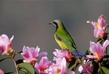 蓝翅叶鹎:小型鸟类,体长15-18厘米。雄鸟通体草绿色,尾蓝绿色,肩和翅亮蓝 色,胸缀有黄色,颏、喉黑色。雌鸟颏,喉蓝绿色。栖息在海拔1500米以下的常绿阔叶林、次生林和林缘疏林灌丛中。…全部>>