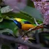 金额叶鹎是和平鸟科、叶鹎属的鸟类。体长16-20厘米。额和头顶前部金桔色,整个上体包括两翅表面草绿色。颏、喉黑色,其外围有一圈黄色,其余下体浅绿色,翼缘蓝紫色,翅上小覆羽翠蓝色。野外特征极明显,…全部>>