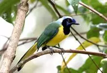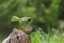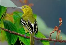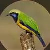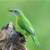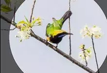 蓝翅叶鹎:小型鸟类,体长15-18厘米。雄鸟通体草绿色,尾蓝绿色,肩和翅亮蓝 色,胸缀有黄色,颏、喉黑色。雌鸟颏,喉蓝绿色。栖息在海拔1500米以下的常绿阔叶林、次生林和林缘疏林灌丛中。…全部>>