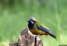 橙腹叶鹎体形大小和金额叶鹎相似,体长16~20厘米。额至后颈黄绿色,其余上体绿色,小覆羽亮钴蓝色,形成明显的肩斑。颏、喉、上胸黑色具钴蓝色髭纹,其余下体橙色。飞羽和尾羽雄鸟黑色、雌鸟绿色。…全部>>