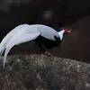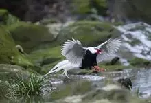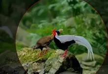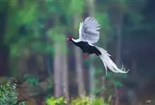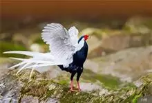 白鹇,是鸡形目雉科鹇属的一种留鸟。雄鸟上体白色并具黑色纹,下体黑色,头顶具黑色长羽冠,尾白而长;雌鸟体型较小,以橄榄褐色为主,下体具白色或皮黄色细纹;虹膜褐色,眼周具红色裸皮,喙黄色,脚鲜红色。…全部>>