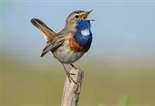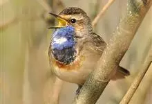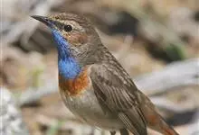 蓝点颏亦称“蓝喉歌鸲”,通称蓝靛颏儿。身体大小和麻雀相似,体长12-13厘米,体重17-18克。头部、上体主要为土褐色。眉纹白色。尾羽黑褐色,基部栗红色。颏部、喉部辉蓝色,下面有黑色横纹。下体白色。…全部>>