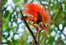 大极乐鸟是极乐鸟属中最大的鸟种。成年雄鸟体长可达到43厘米,雌性可达35厘米。雄鸟的额、颊、喉等墨绿色;头、颈黄色;上体暗赤栗色;腹部葡萄红色,胁部有长饰羽,其基部橙黄,中部黄色,…全部>>
