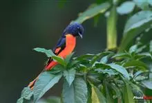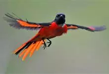 灰喉山椒鸟:共有8个亚种。体长18-22厘米。雄鸟头部和背亮黑色,腰、尾上覆羽和下体朱红色,翅黑色具一大一小的两道朱红色翼斑。中央尾羽黑色,外侧尾羽基部黑色,端部红色。…全部>>
