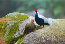白鹇,是鸡形目雉科鹇属的一种留鸟。雄鸟上体白色并具黑色纹,下体黑色,头顶具黑色长羽冠,尾白而长;雌鸟体型较小,以橄榄褐色为主,下体具白色或皮黄色细纹;虹膜褐色,眼周具红色裸皮,喙黄色,脚鲜红色。…全部>>