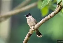 白颊鹎是雀形目鹎科鸟类。体长19—21厘米。雌雄相似。成鸟头部深灰色具一显著的羽冠,白色脸侧具一黑色点状斑纹。颏部、喉部黑色;胸部、腹部、两胁近白色;背部、两翼近灰色;尾下覆羽黄色,尾羽灰色,…全部>>