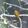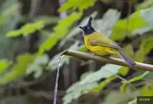 黑冠黄鹎:体长18-21厘米,是一种中等体型偏黄色鹎。整个头、颈、颏、喉黑色,头顶有显著直立的羽冠,黑色,上体褐橄榄黄绿色,下体橄榄黄色。虹膜偏红;嘴及脚黑色。…全部>>
