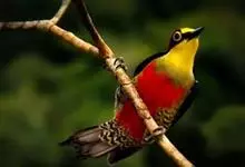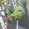 火尾绿鹛是莺科、绿鹛属小型鸟类,体长11-14厘米。上体绿色,头顶至枕具黑色鳞状斑,眼先和眼后黑色,眉纹黄绿色。两翅黑色具黄色和红色翅斑及白色端斑,极为醒目。中央一对尾羽绿色,外侧尾羽鲜红色。…全部>>