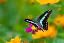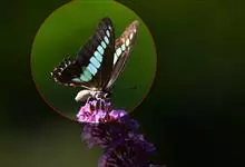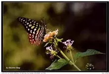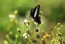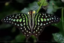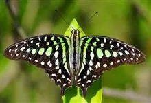 青带凤蝶Graphium sarpedon ,又名青凤蝶,是最普遍的中型凤蝶,飞行速度很快。青带凤蝶的翅膀中央有许多浅蓝色的斑点,很整齐地排列成一条直线。这些斑点由上而下逐渐变大,就像一条青色的带子。全部>>