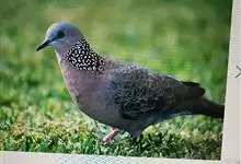 珠颈斑鸠,别名花斑鸠、珍珠鸠、花脖斑鸠、鸪鹪,是鸠鸽科副斑鸠属鸟类。体型中等,体长27~34cm,体重120~205g,雌鸟和雄鸟羽色相似,但雌鸟不如雄鸟羽色亮泽。珠颈斑鸠前额至头顶羽色稍淡,…全部>>
