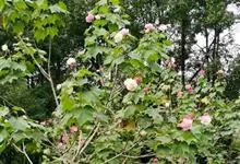 木芙蓉,锦葵科木槿属落叶灌木或小乔木。小枝上有细绒毛;叶片为卵状心形,托叶为披针形,常早落;花单生,花萼为钟形,花冠初为白色或淡红色,后逐渐变为深红色;果实为扁球形,有淡黄色的毛附着。花期8到10月。…全部>>