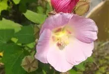 木芙蓉,锦葵科木槿属落叶灌木或小乔木。小枝上有细绒毛;叶片为卵状心形,托叶为披针形,常早落;花单生,花萼为钟形,花冠初为白色或淡红色,后逐渐变为深红色;果实为扁球形,有淡黄色的毛附着。花期8到10月。…全部>>