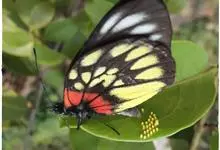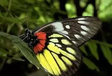 报喜斑粉蝶是粉蝶科斑粉蝶属的一种动物,又名红肩粉蝶、藤粉蝶等。幼虫群集性很强,从同一卵块孵化出的幼虫,幼龄期全部群集在一起取食,高龄幼虫常分散成小群。幼虫群集危害叶片,造成秃枝,严重者可将树吃成光杆,…全部>>