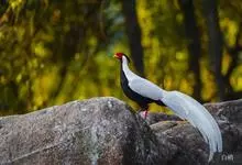 白鹇,是鸡形目雉科鹇属的一种留鸟。雄鸟上体白色并具黑色纹,下体黑色,头顶具黑色长羽冠,尾白而长;雌鸟体型较小,以橄榄褐色为主,下体具白色或皮黄色细纹;虹膜褐色,眼周具红色裸皮,喙黄色,脚鲜红色。…全部>>