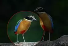 蓝八色鸫是雀形目八色鸫科的鸟类,体长约24厘米,体重109克左右。体型圆胖,尾短,腿长。羽色鲜艳,头顶两侧橘黄色的宽带延伸至颈背,宽宽的过眼纹黑色,脸颊皮黄,髭纹黑,尾亮蓝色。雌鸟较雄鸟色暗,…全部>>