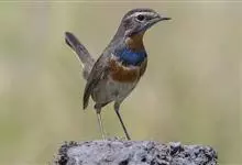 蓝点颏亦称“蓝喉歌鸲”,通称蓝靛颏儿。身体大小和麻雀相似,体长12-13厘米,体重17-18克。头部、上体主要为土褐色。眉纹白色。尾羽黑褐色,基部栗红色。颏部、喉部辉蓝色,下面有黑色横纹。下体白色。…全部>>