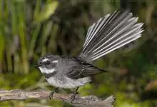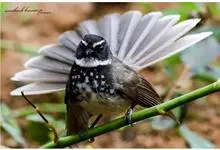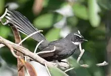 白眉扇尾鹟:体长17厘米,是一种中等体型的灰色扇尾鹟。色彩独特。宽宽的眉纹及前额白色,尾有白色宽边。髭纹白色,与黑色的脸及喉成对比;尾呈扇形,4对中央尾羽黑褐色,邻近两对具宽的白色端斑,最外侧两对白…全部>>