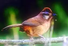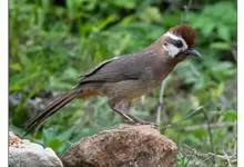白颊噪鹛是雀形目噪鹛科噪鹛属鸟类,又称土画眉、小画眉、小噪鹃。成鸟额至头顶栗褐色,长眉纹、眼先和颊纹棕白色,眼后至耳羽深褐色,…全部>>