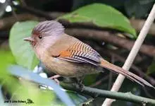 栗额斑翅鹛是噪眉科、斑翅鹛属中型鸟类,体长20-23厘米。头顶具浓密的羽冠,前额栗棕色,头顶灰褐色。上体棕褐色,两翅棕褐色具黑色横斑,翅基外缘有一黑斑,尾呈凸状,棕褐色具黑色横斑。下体棕褐色,…全部>>