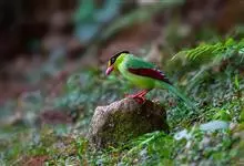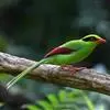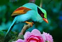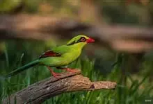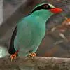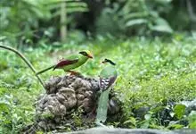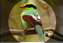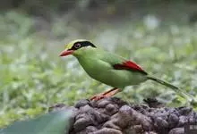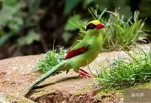 蓝绿鹊:中型鸟类,共有5个亚种。体长36-38厘米。尾长,嘴、脚红色。通体羽色主要为草绿色,宽阔的黑色贯眼纹向后延伸到后颈,在绿色的头侧极为醒目。两翅栗红色,内侧飞羽具黑色次端斑和白色尖端。尾绿色,…全部>>