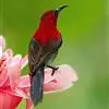 叉尾太阳鸟,雀形目太阳鸟科太阳鸟属留鸟;为小型鸟类,雄鸟头顶辉蓝绿色,上体橄榄绿色,腰明黄色,中央尾羽亮翠蓝色,羽轴针状延长,外侧尾羽黑色具白色端斑,头侧黑色,颜、喉和胸为绛红色,…全部>>