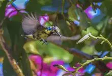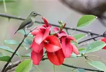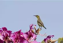 叉尾太阳鸟,雀形目太阳鸟科太阳鸟属留鸟;为小型鸟类,雄鸟头顶辉蓝绿色,上体橄榄绿色,腰明黄色,中央尾羽亮翠蓝色,羽轴针状延长,外侧尾羽黑色具白色端斑,头侧黑色,颜、喉和胸为绛红色,…全部>>