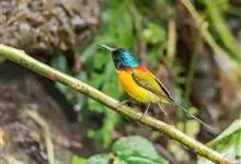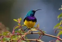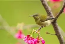 黄腹花蜜鸟是雀形目太阳鸟科花蜜鸟属鸟类。体型较小、喙略短而弯、腹部黄色。雄鸟繁殖季节颏及胸黑紫色并泛金属光泽,具有绯红色及灰色胸带,将上腹部黑色斑与前胸隔开,肩斑为橙黄色丝质羽,上体橄榄绿色,…全部>>