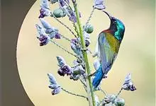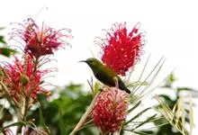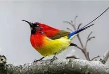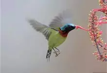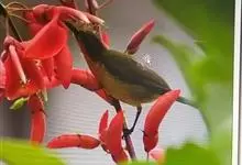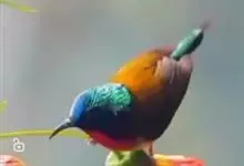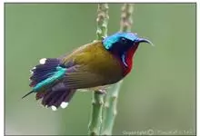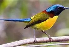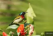 绿喉太阳鸟:共有9个亚种。小型鸟类,雄鸟体长13-15厘米、雌鸟10-12厘米。雄鸟前额至后颈、颏和喉辉绿色,头侧黑色,颈侧和背暗红色,两肩、下背橄榄绿色,腰鲜黄色,尾上覆羽和中央尾羽暗绿色,…全部>>