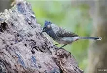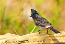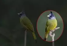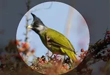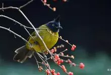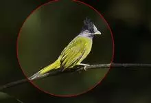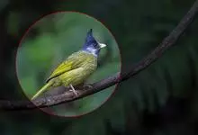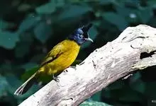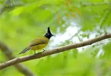 黑冠黄鹎:体长18-21厘米,是一种中等体型偏黄色鹎。整个头、颈、颏、喉黑色,头顶有显著直立的羽冠,黑色,上体褐橄榄黄绿色,下体橄榄黄色。虹膜偏红;嘴及脚黑色。…全部>>
