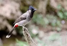 黑喉红臀鹎是雀形目鹎科鹎属鸟类,别称有黑头公、红臀鹎。头顶黑色具光泽;后颈、肩和背暗褐具灰色狭缘;腰羽几纯暗褐,尾上覆羽近白色,羽端浅灰褐色;尾羽褐黑,中央尾羽具狭窄的白色端斑,…全部>>