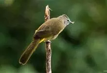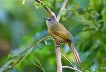 黄绿鹎,小型鸟类,体长19-22厘米。额至头顶暗褐具灰色羽缘,眼先黑色,其上面有一粗著的白纹从鼻后至眼,在黑色的头部极为醒目。上体橄榄绿褐色。颏、喉淡灰色或灰白色,胸灰褐色具橄榄黄色羽缘,…全部>>