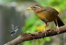 画眉,是雀形目噪鹛属一种鸣禽,别名为文武鸟、金画眉。成年画眉体长为21~25cm,体重为49~75g,眼周具一圈白色羽毛,并向眼后延伸形成一条显著的白色眉纹;上体覆羽呈卡其色,飞羽为暗褐色,…全部>>