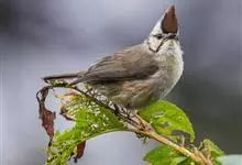 褐头凤鹛小型鸟类,体长12~13厘米。头顶有可竖立的红褐色羽冠,头侧、枕、颊、喉和下体白色,羽冠两侧黑色,头的两侧各有一条黑线,其下端与黑色颧纹末端相接,上端与从眼后伸出的一条黑线相连,…全部>>