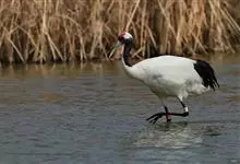 丹顶鹤:是鹤科、鹤属的一种大型涉禽,体长120-160厘米。颈、脚较长,通体大多白色,头顶鲜红色,喉和颈黑色,耳至头枕白色,脚黑色,站立时颈、尾部飞羽和脚黑色,头顶红色,…全部>>