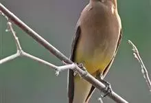 雪松太平鸟体形中等大小,体长约在19厘米左右。该物种雄雌同形同色,太平鸟成鸟额部及面部前端为栗色,向头后部颜色逐渐变浅;额基部、眼先、眼周及眼后部有黑色纹带,颌部亦有黑色区域;枕部黑色,与贯眼的黑色…全部>>