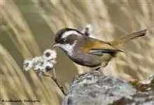 金眼鹛雀是莺科、鹛雀属小型鸟类。体长16-20厘米。头顶和上体棕褐色,两翅表面肉桂红色,尾褐色具明暗相间横斑。眼周金黄色,眼先、眼上、眼下、颊以及颏、喉和上胸概为白色,其余下体茶黄色,脚橙黄色。…全部>>