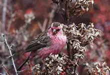 喜马拉雅白眉朱雀:小型鸟类,体长15-17厘米,体重24-35克。额基、眼先深红色,前额和一条长而宽阔的眉纹珠白色沾有粉红色并具丝娟光泽,在暗色的头部极为醒目。头顶至背棕褐或红褐色、具黑褐色羽干纹,…全部>>