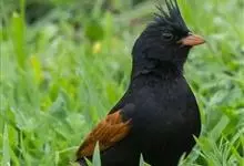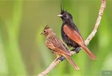凤头鹀:属小型鸣禽,体重21-31克,体长134-175毫米。以头顶的细长羽冠为特征,雄鸟全身几乎均为黑色具蓝色光泽,两翅和尾以及尾上覆羽栗红色。雌鸟具短的褐色羽冠,上体暗橄榄褐色,…全部>>